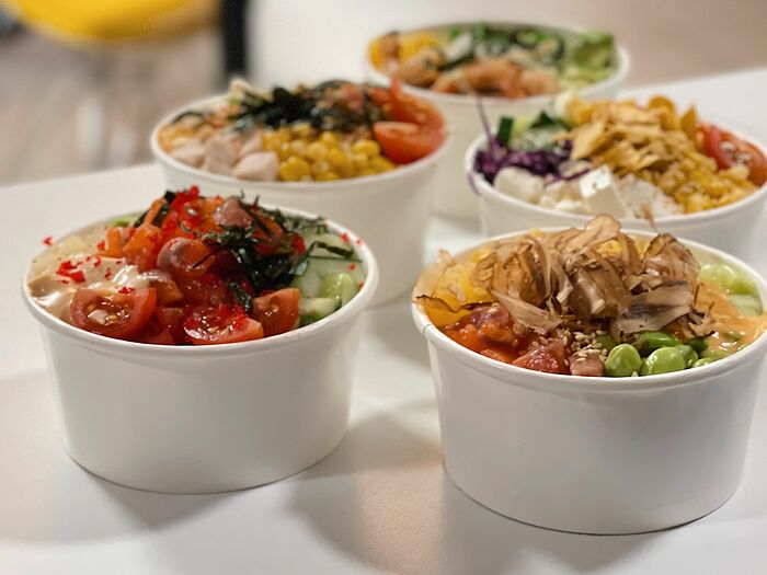 Поке с лососем, авокадо и ананасом под соусом том ям