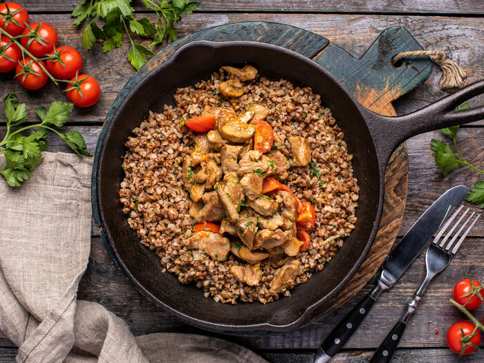 Ароматное филе индейки с гречкой в сметанно-чесночном соусе