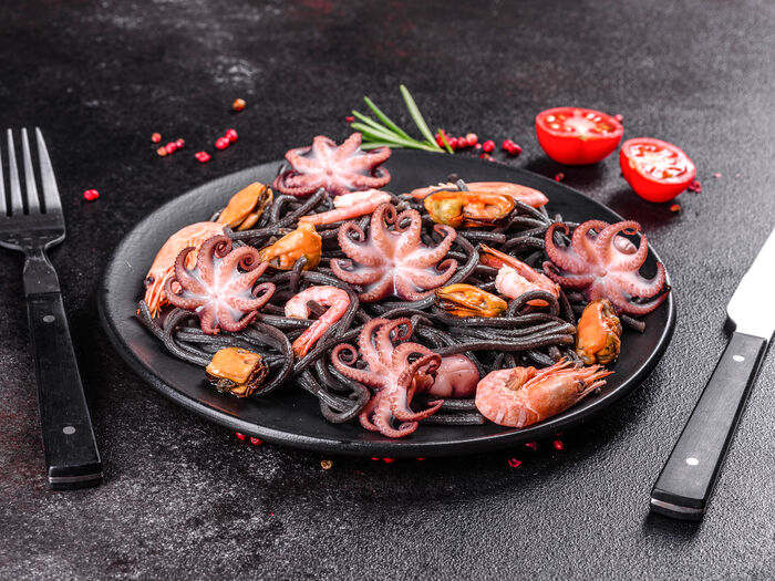 Гречневая лапша с креветками и кальмаром в остром соусе Кимчи
