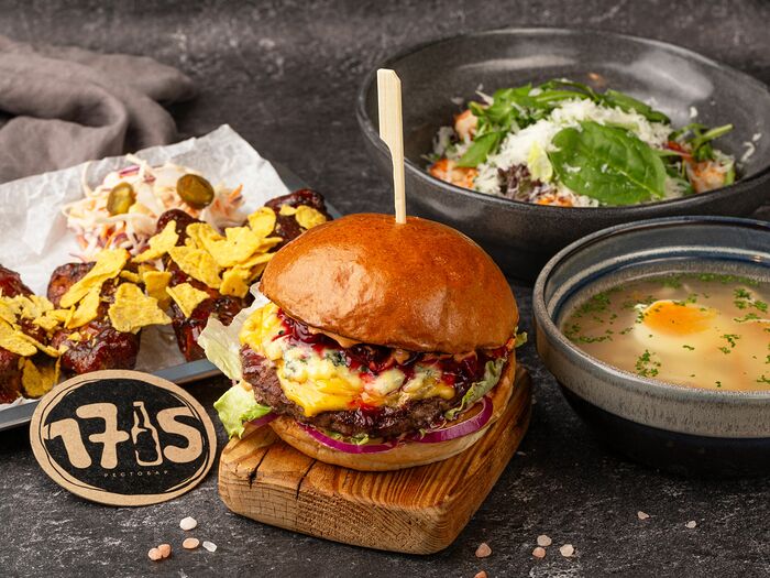 Бургер с мраморной говядиной, вишней и сыром дорблю