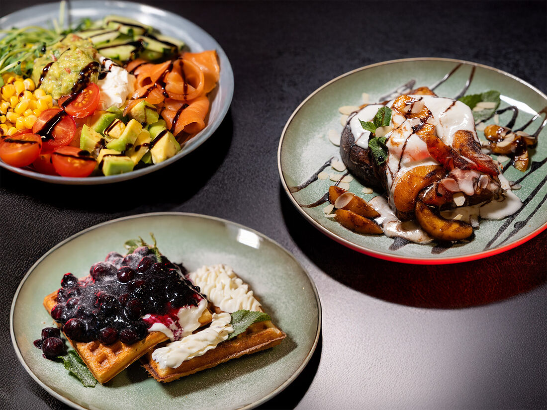 Сладкие вафли с мороженым и ягодным соусом