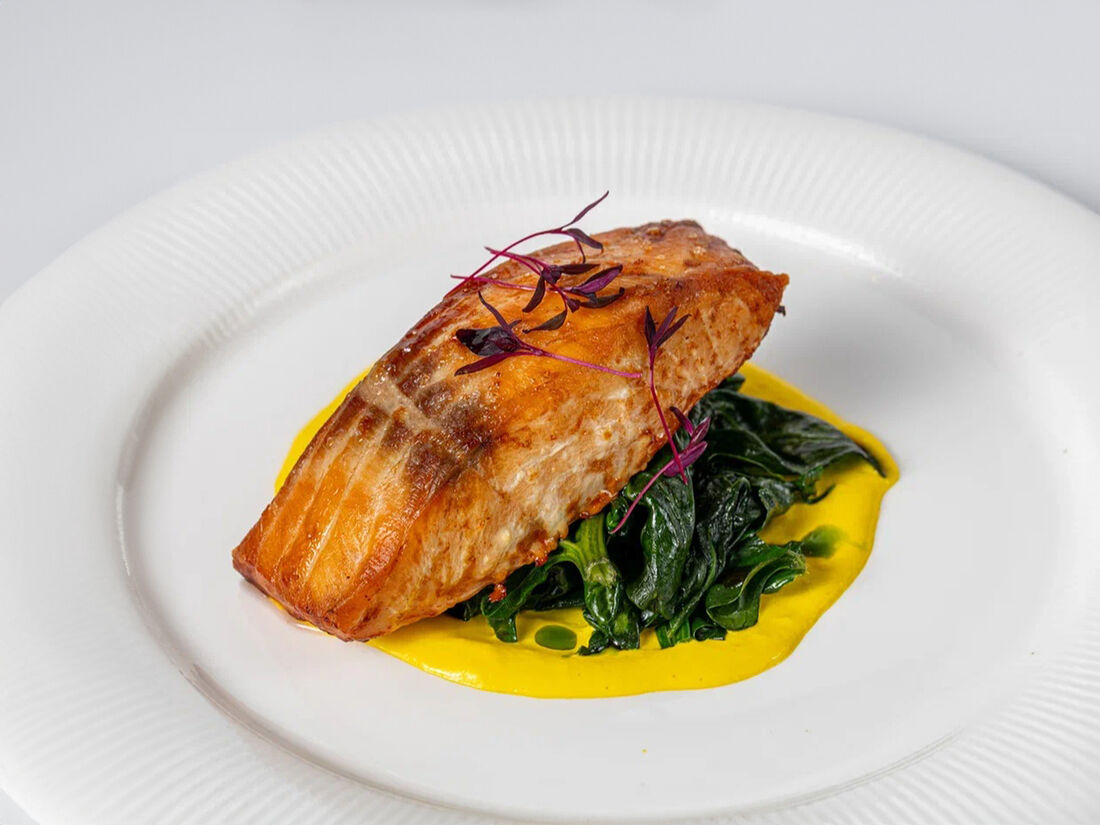 Запечённый палтус, крем-пюре из цветной капусты на кокосовых сливках