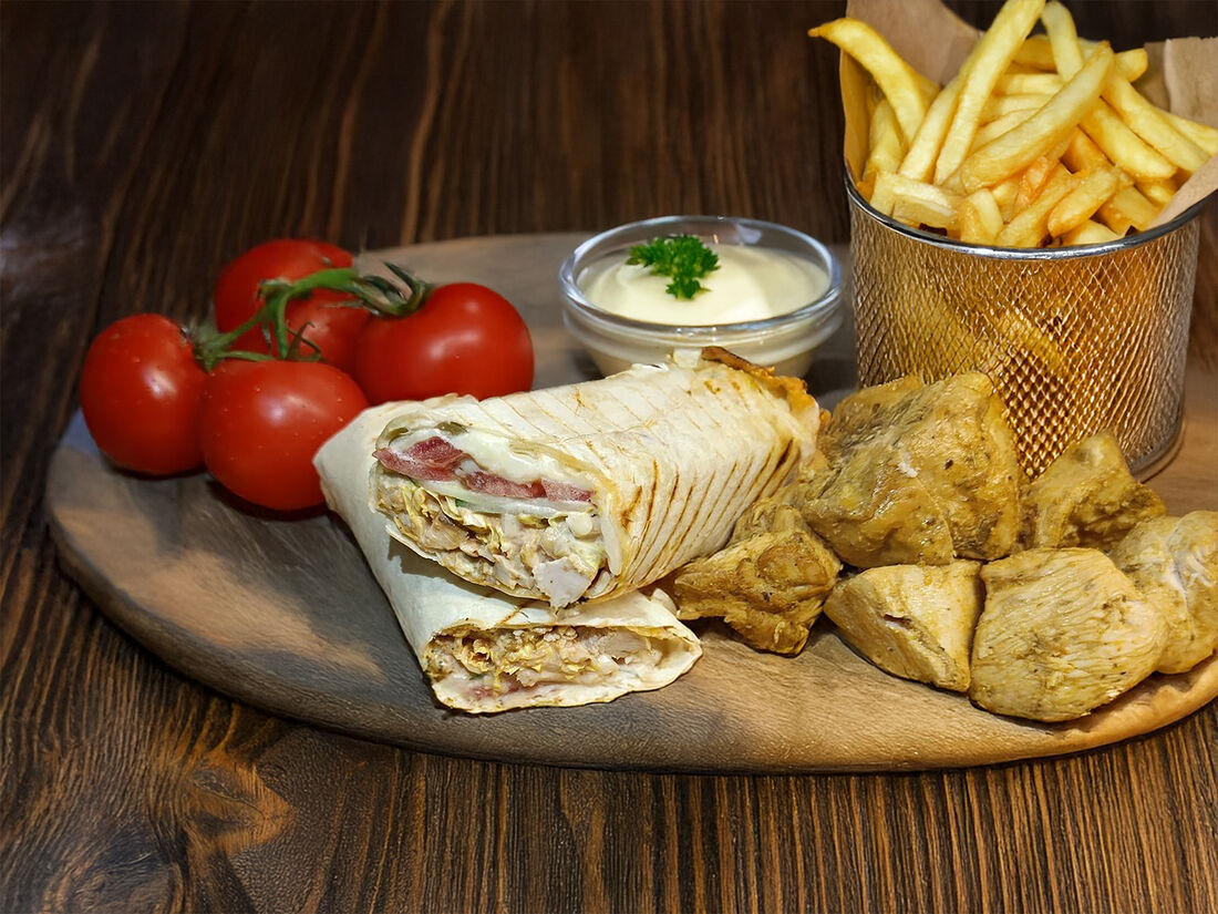 Шаверма в тарелке с шашлыком из куриной грудки