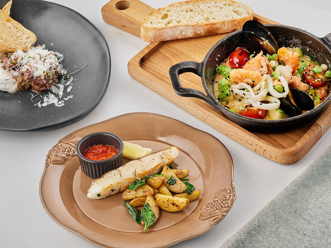 Филе судака, картофельный крем со шпинатом и цедрой лайма