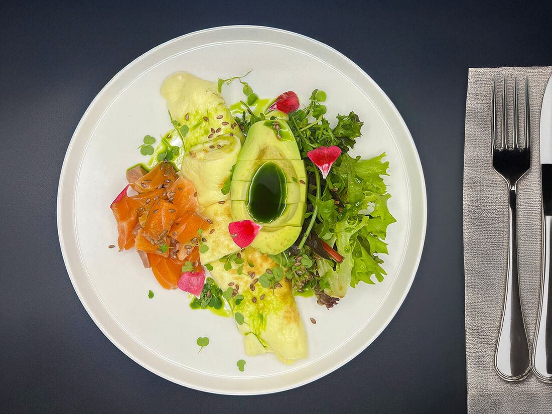 Скрэмбл со шпинатом, авокадо, форелью и бобами эдамаме