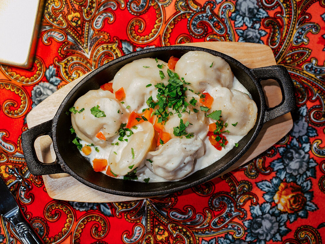 Пельмени из трех видов мяса, запеченные в сливочно-чесночном соусе