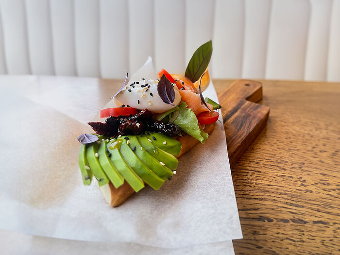 Тигровые креветки с авокадо и микс-салатом