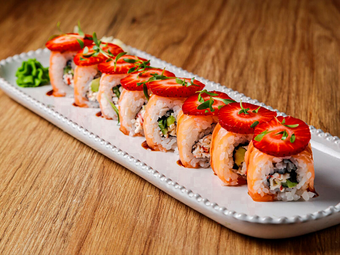 Ролл снежный краб, опалённый лосось, клубника