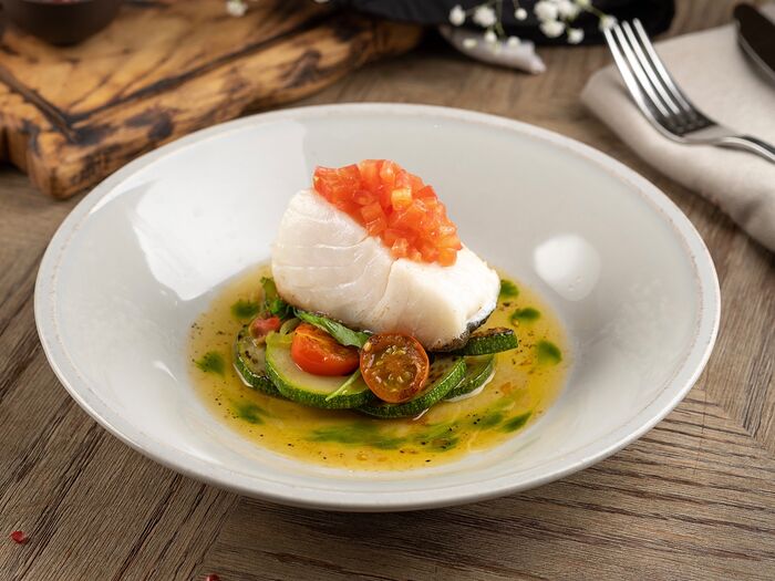 Треска с тартаром из помидоров и сезонными овощами