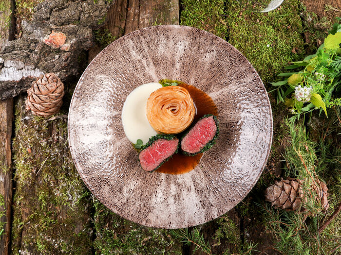 Тартар из говядины с картофелем пай и муссом из козьего сыра