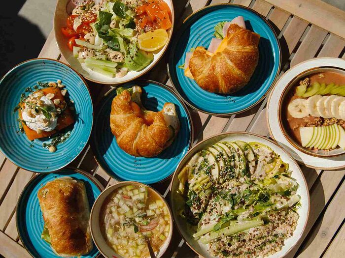 Большой завтрак с круассаном и лососем