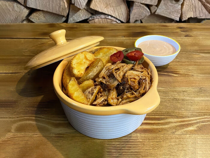 Рваная свинина с картофелем фри (остро)