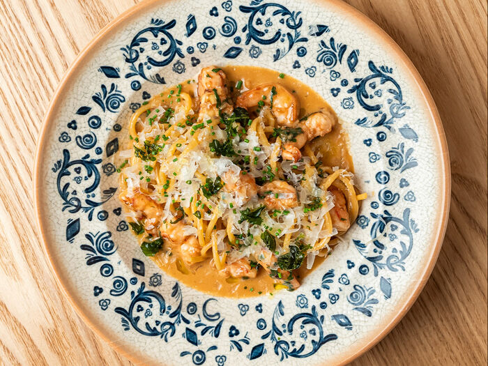 Паста с соусом биск и креветками