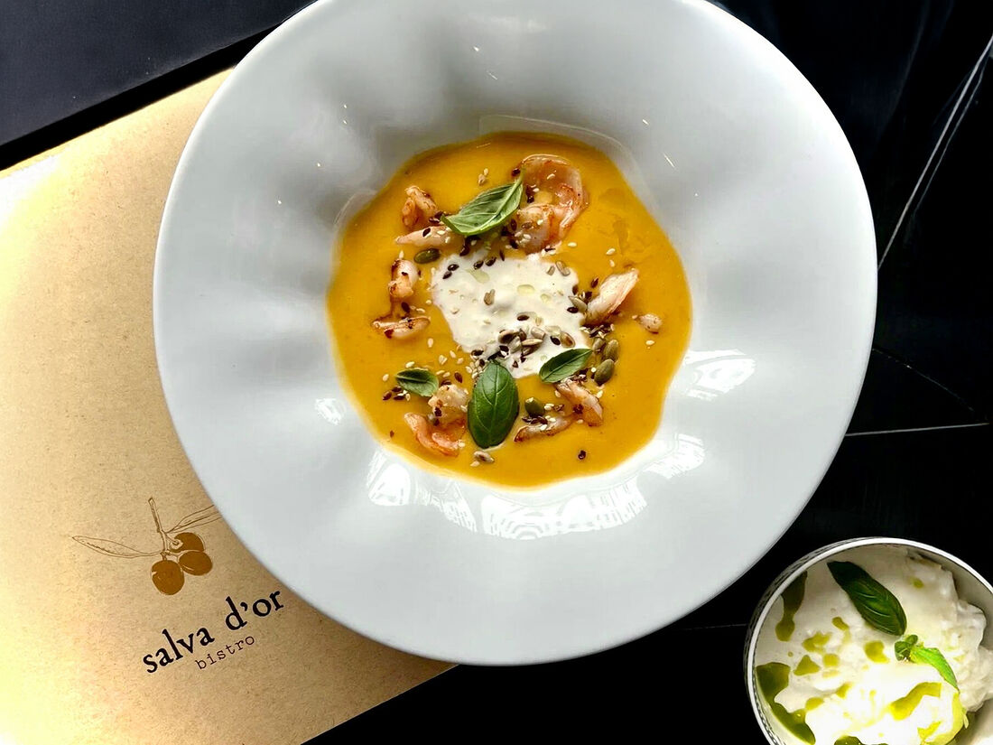 Тыквенный крем-суп со страчателлой и креветками