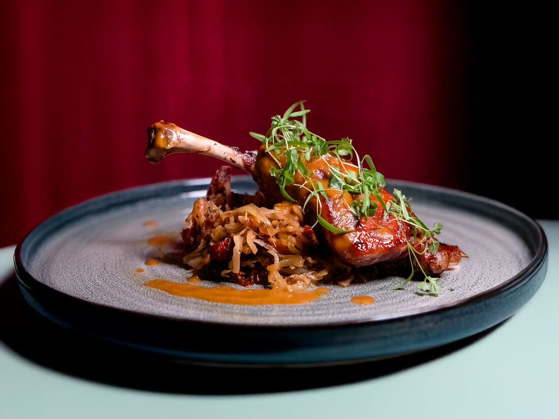 Утиная ножка конфи с жареной капустой и мясным соусом