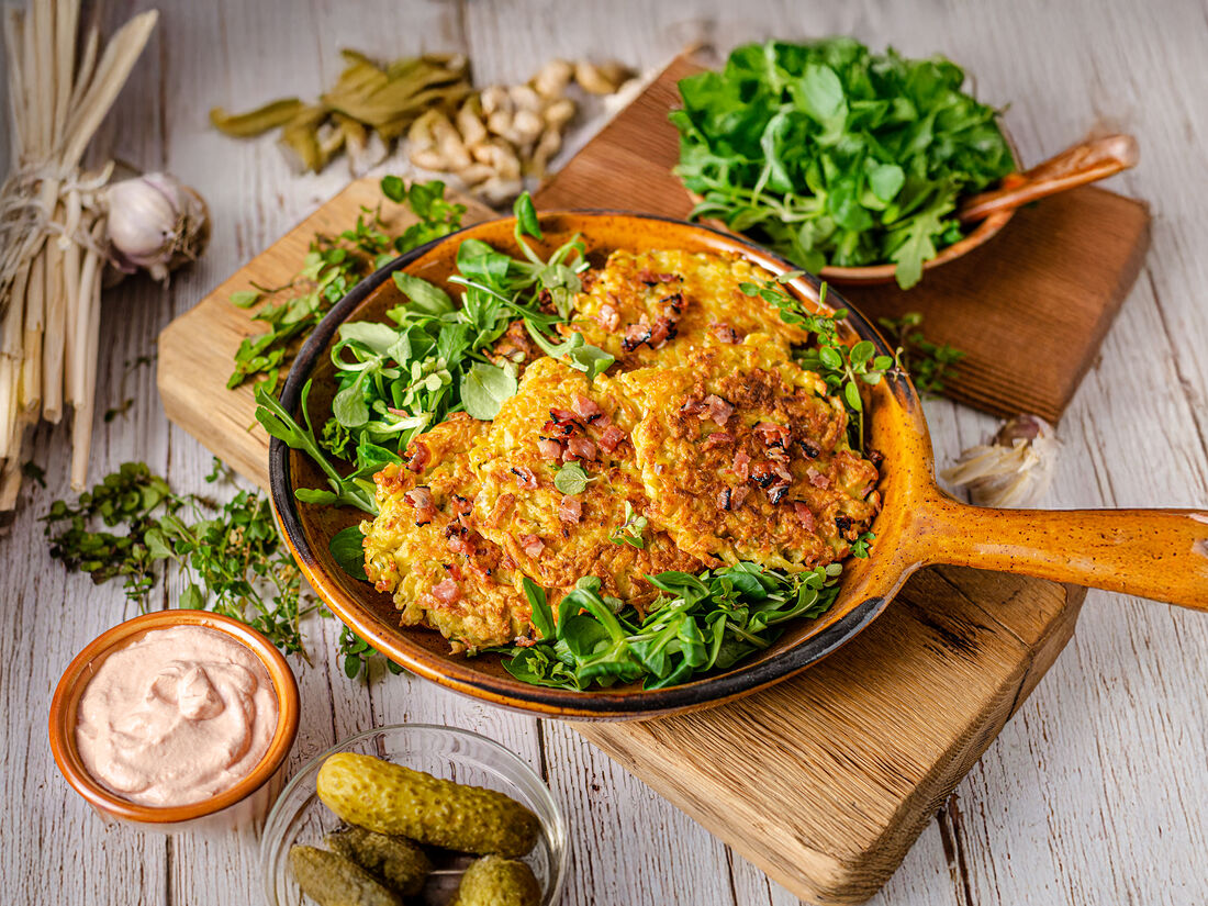 Драники с печеной тыквой и копченым беконом