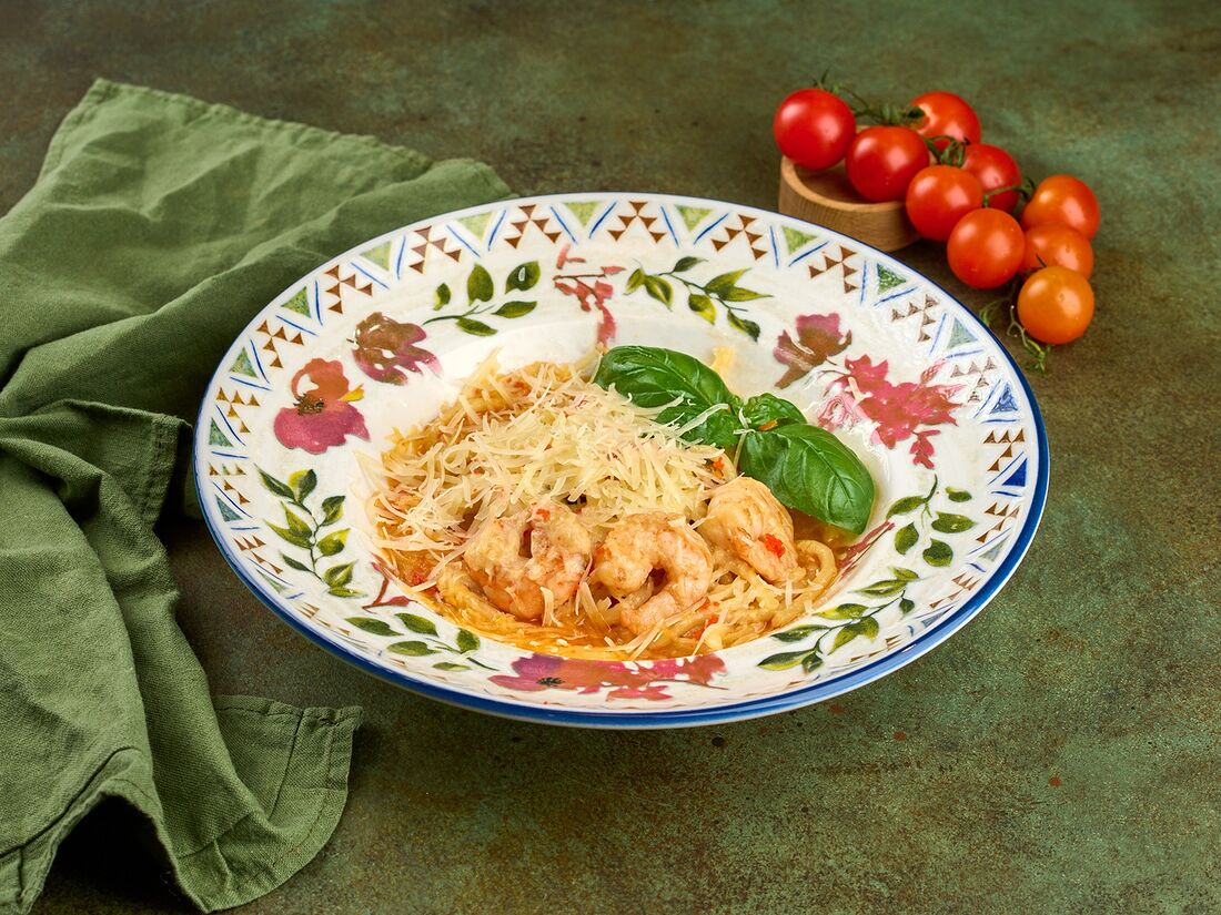 Паста с курицей, креветкой и соусом свит чили