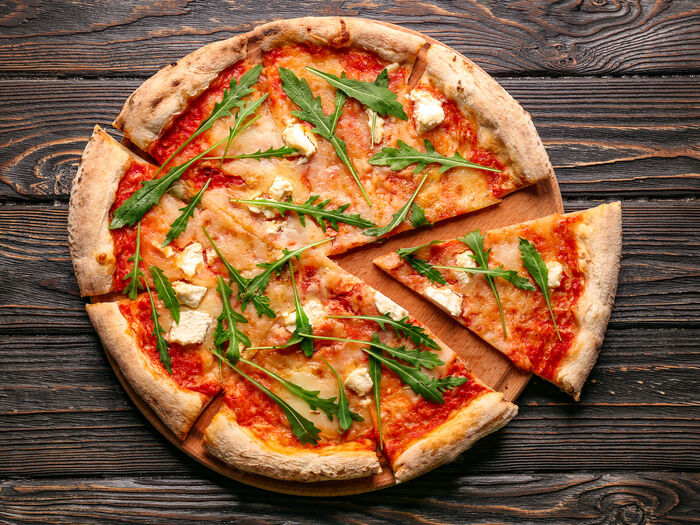 Пицца с ветчиной, грибами и страчателлой