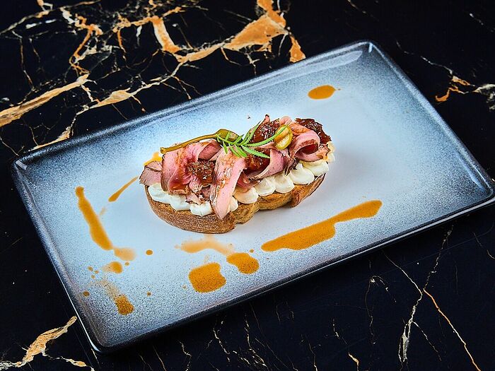 Брускетта с вяленой уткой в сливочном соусе и карамелизированной грушей под соусом дорблю