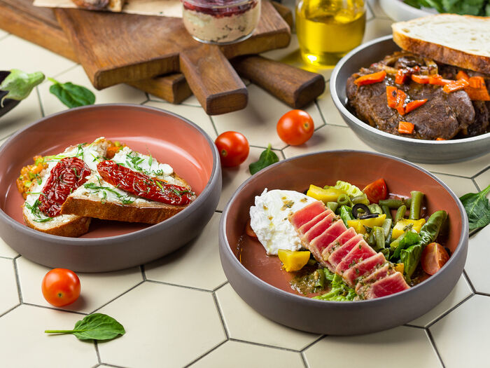 Брускетта с томленой говядиной и баклажанами