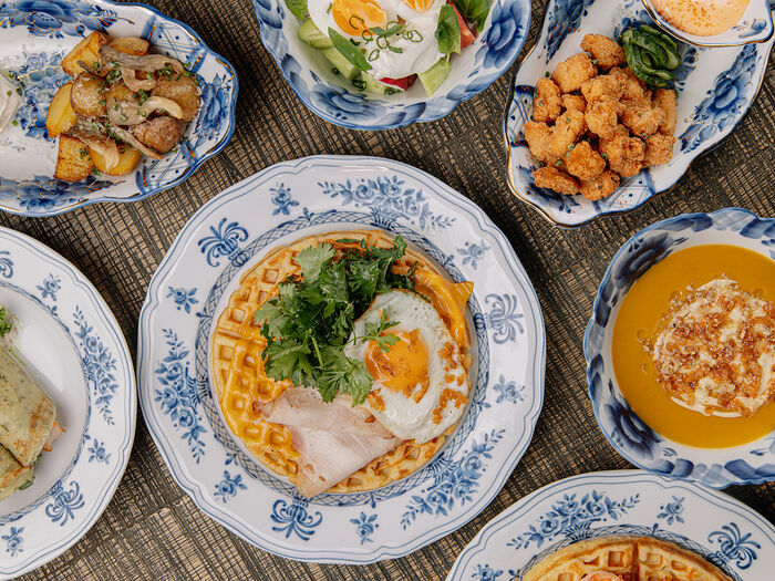 Картофельная вафля с колбаской из индейки, глазуньей и сыром чеддер