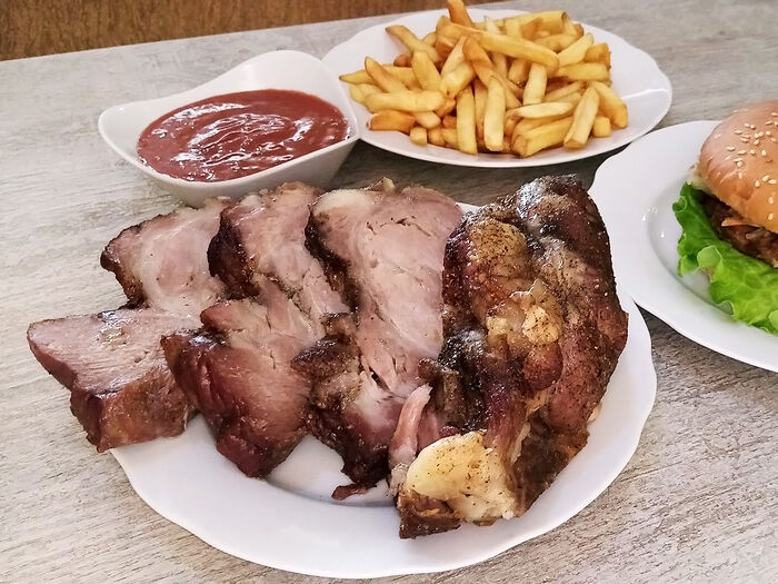 Шашлык из свинoй шеи, картофель фри и салат