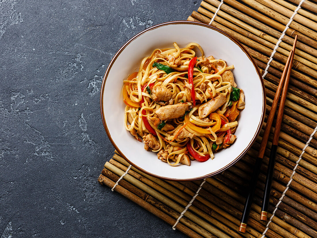 Курица в чесночном соусе с лапшой удон