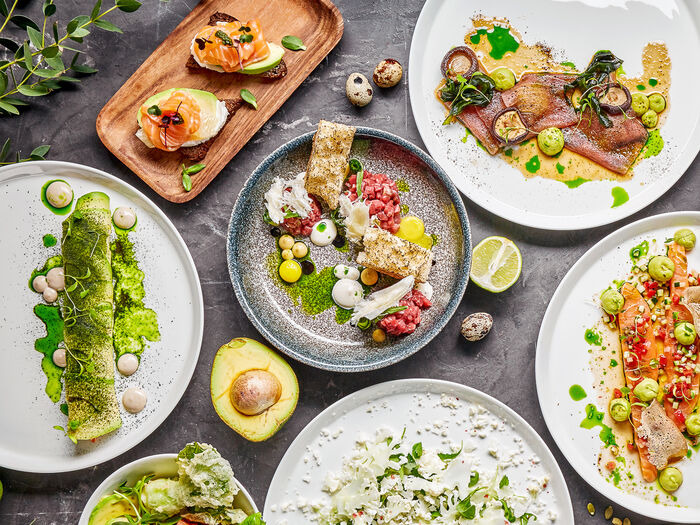 Брускетта с лососем, авокадо и соусом песто