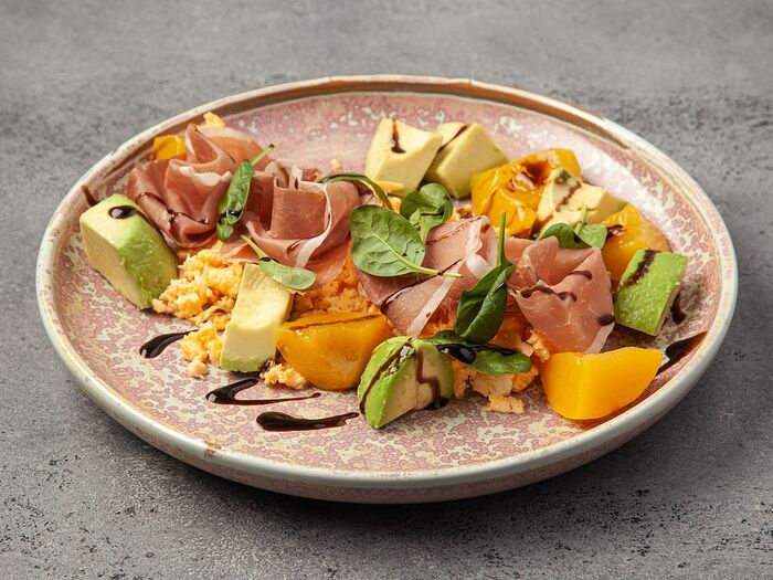 Яйцо пашот с лососем, чили, кремом из авокадо и сырным муссом