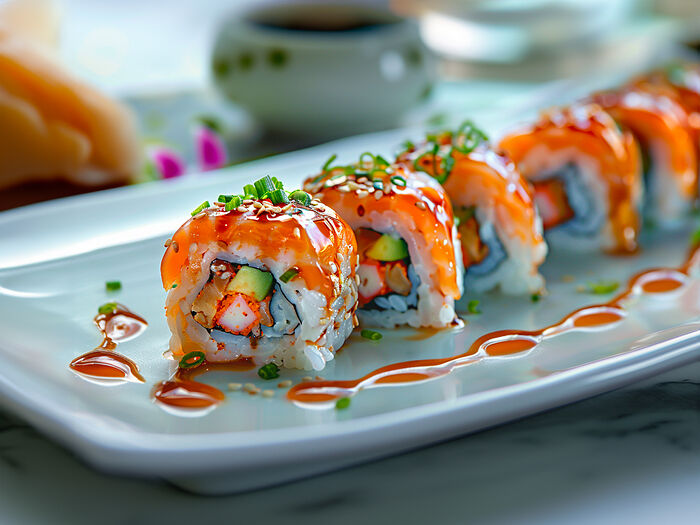 Хикари ролл с филе тунца и лосося под острым соусом спайси