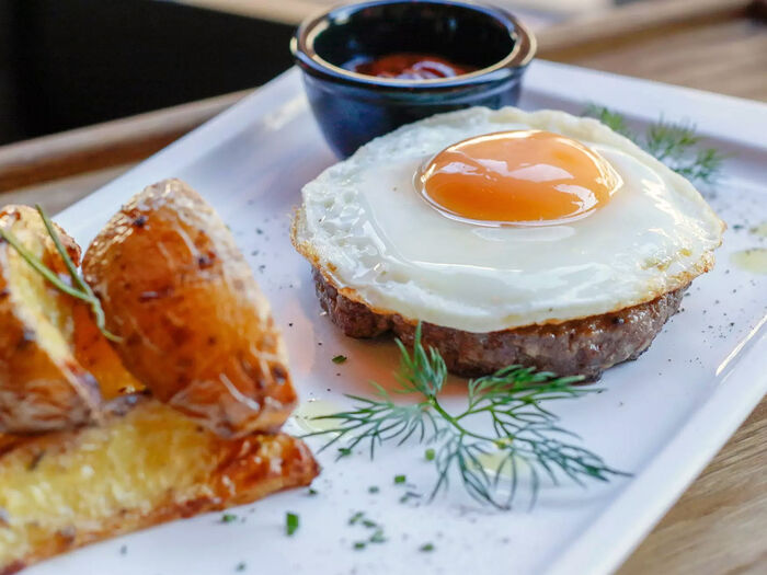 Бифштекс с яйцом, картошкой фри и соусом барбекю