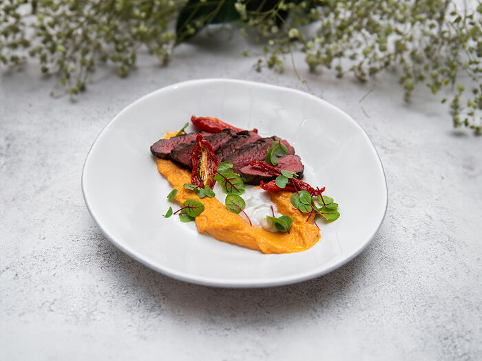 Стейк Фланк с пюре из батата и соусом грюйер