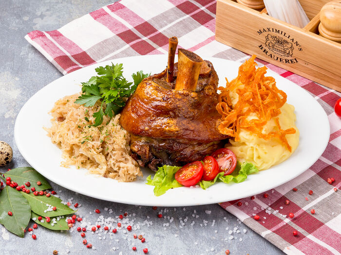 Томленый свиной бок с картофельным пюре и стейком из капусты
