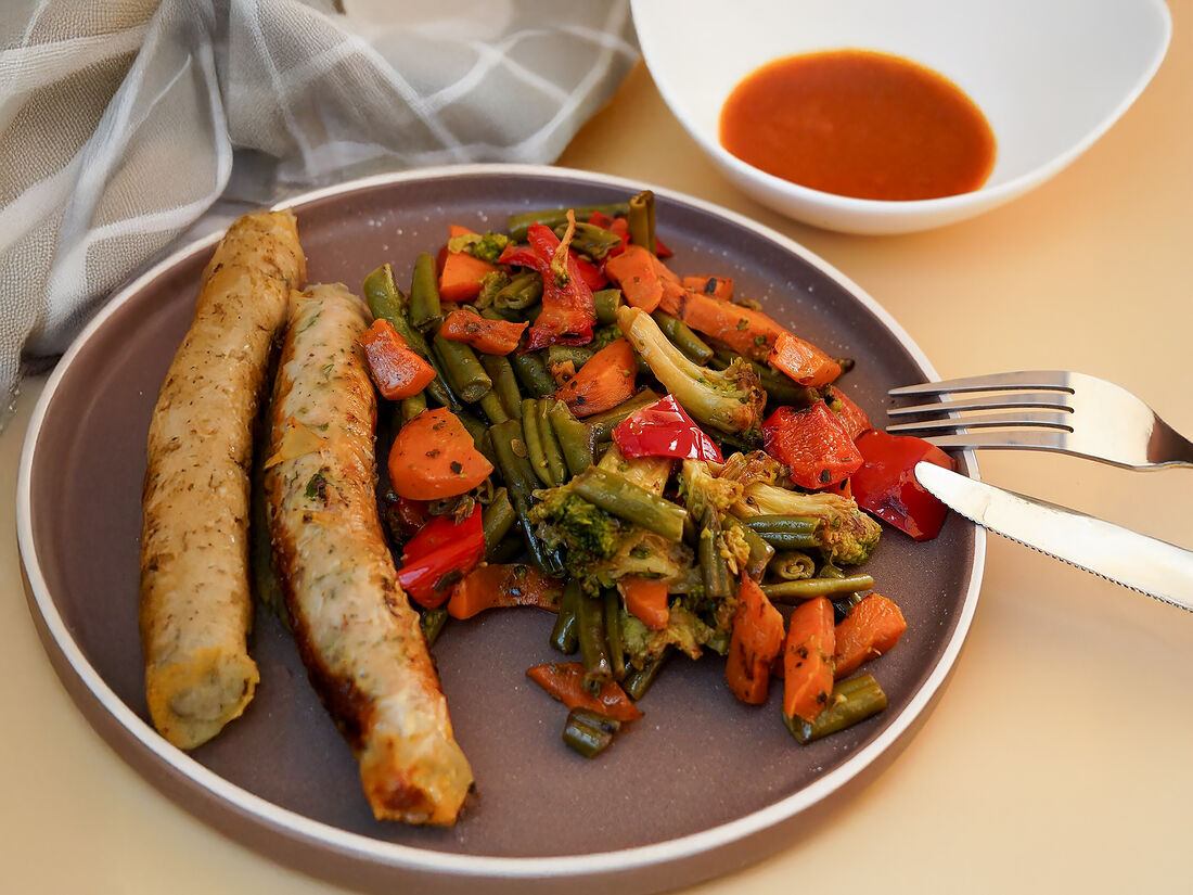 Колбаски куриные с пряными овощами и зеленью