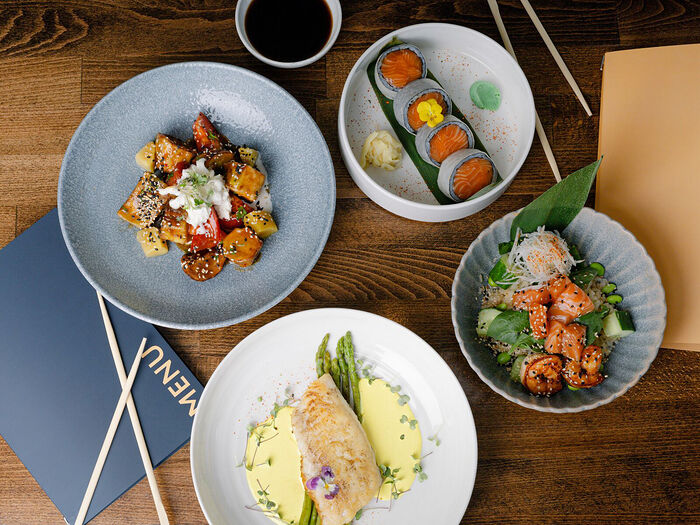 Поке с копчёным угрем, сливочным сыром и водорослями чука