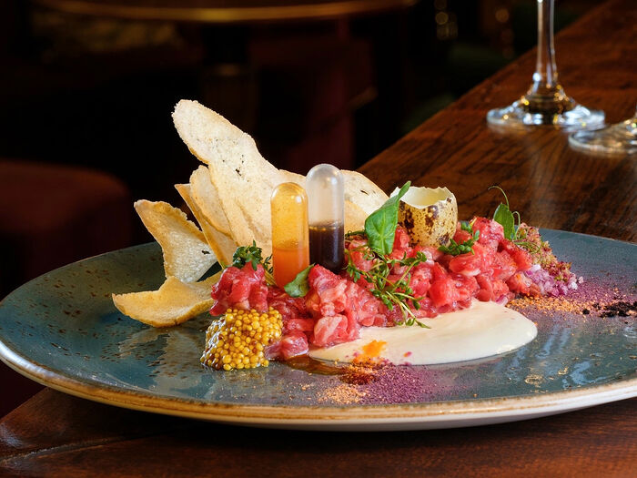 Тартар из телятины с подкопченной на еловых ветках сметаной