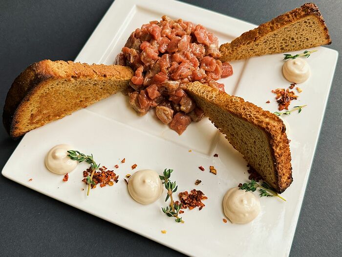 Тартар из говядины с устричным и шафрановым соусом