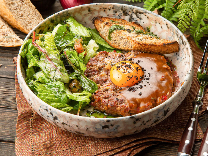 Бифштекс из мраморной говядины с микс салатом и песто