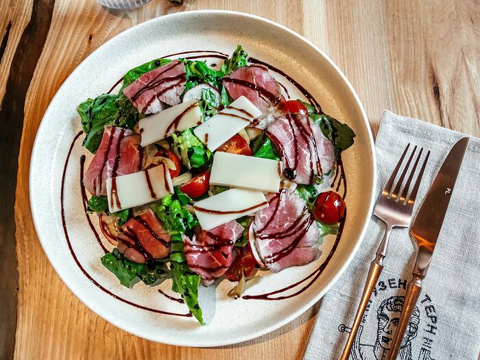 Брускетта с томленой говядиной и черри кимчи