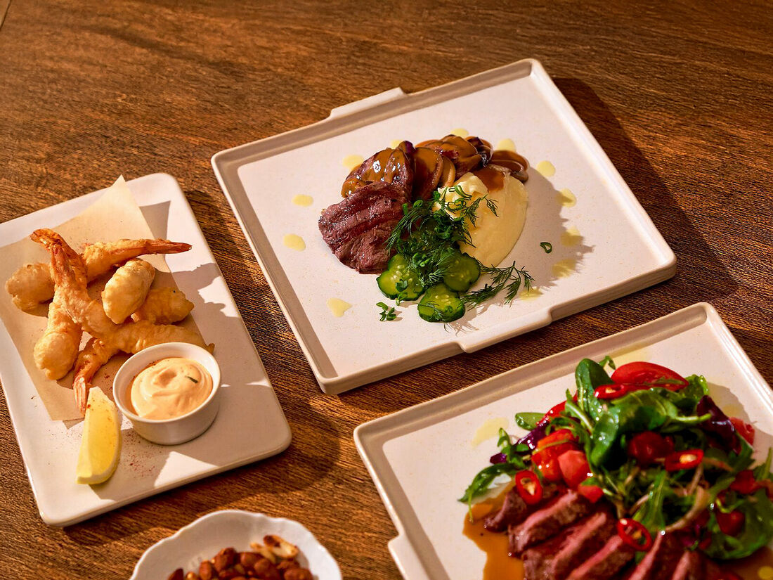 Стейк-салат с печеным перцем, свежими томатами и с соусом демиглас