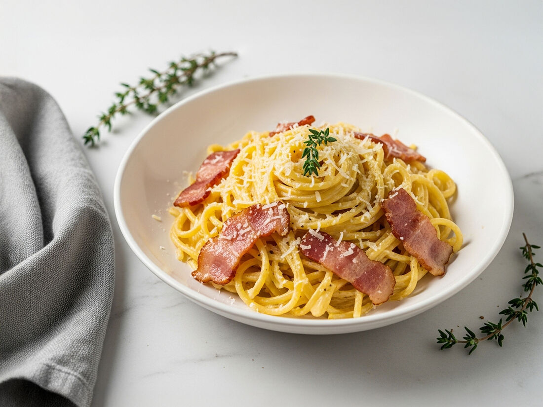 Паста тальятелле с курицей и беконом