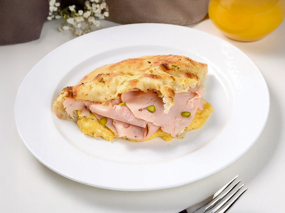 Панини с трюфельным скремблом и мортаделлой на фокаччо