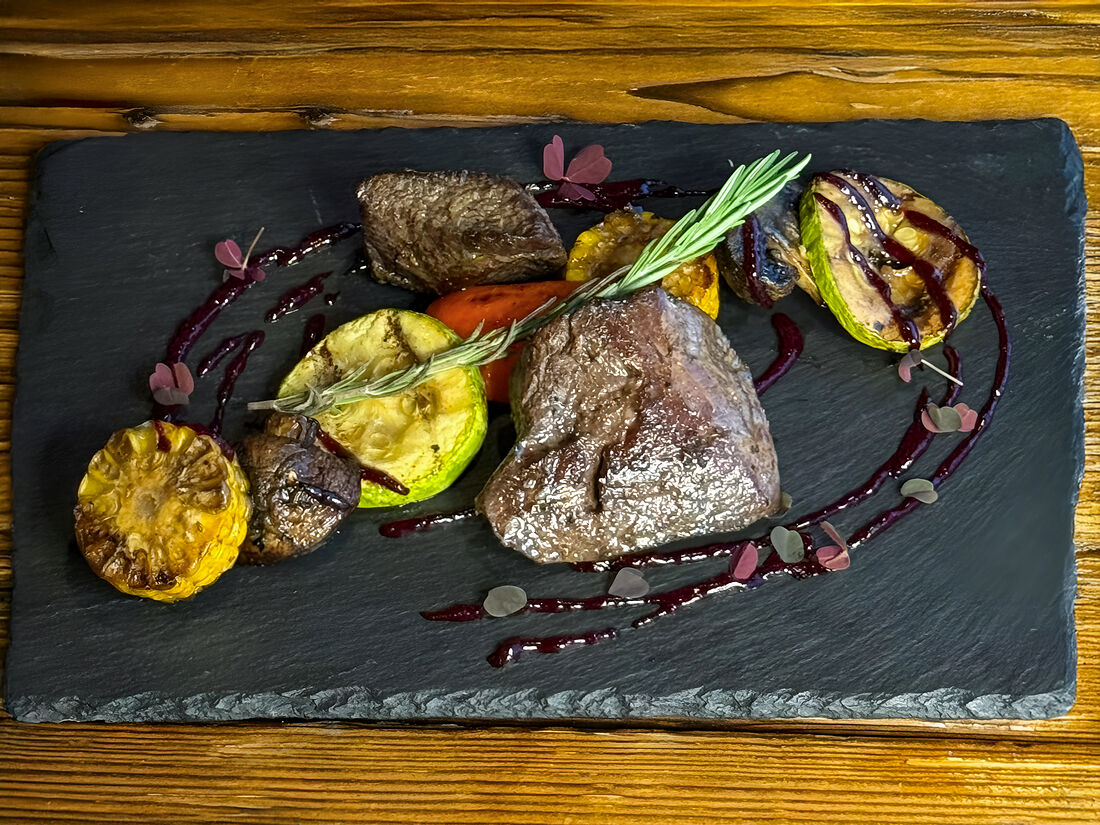 Филе оленя с печеными овощами и соусом из черной смородины