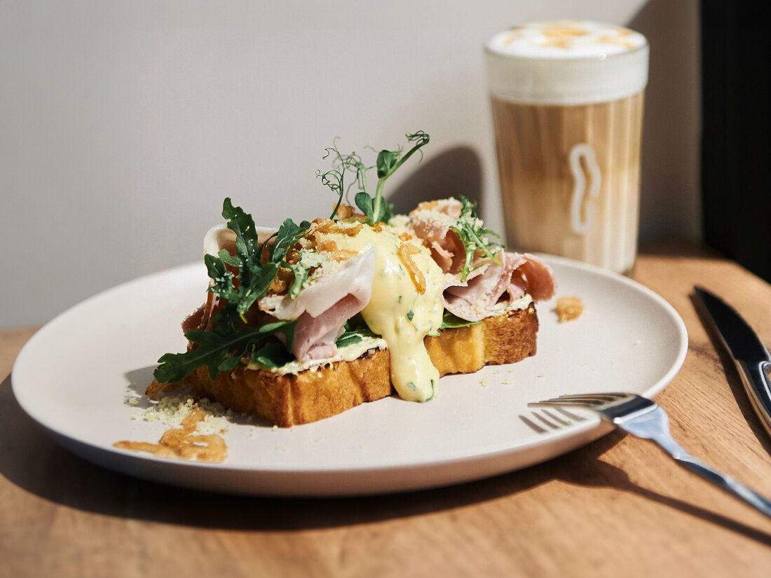 Яйцо Бенедикт на булочке бриошь с тамбовским окороком