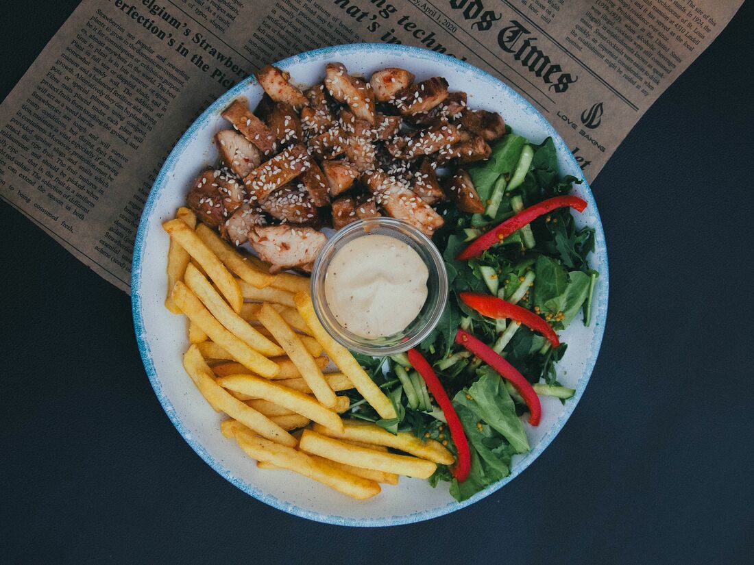 Куриное филе в кунжуте, картофель фри, салат