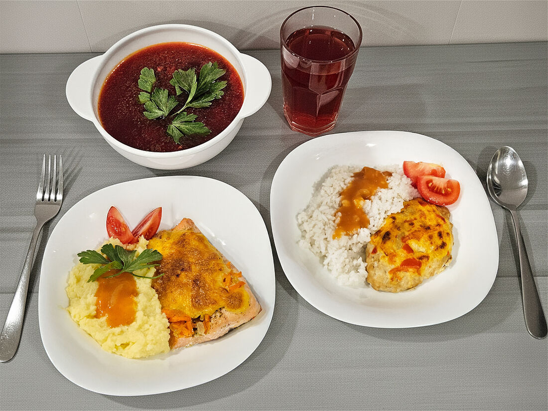 Макароны по-флотски, салат оливье с курицей, мохито, творожная запеканка и куриные биточки в соусе