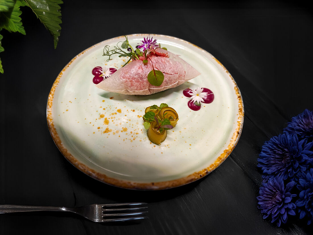 Сугудай из макрели с цитрусовой икрой, луковым мармеладом и топленым картофелем