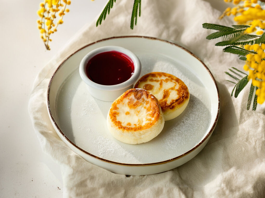 Мини-сырники с кремом-чиз и черничным вареньем