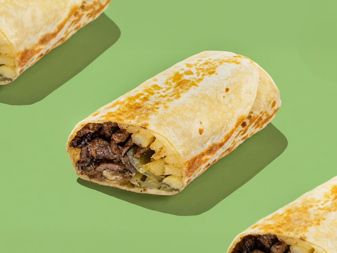 Бургер в лаваше с говядиной, соусом релиш и хрустящим луком