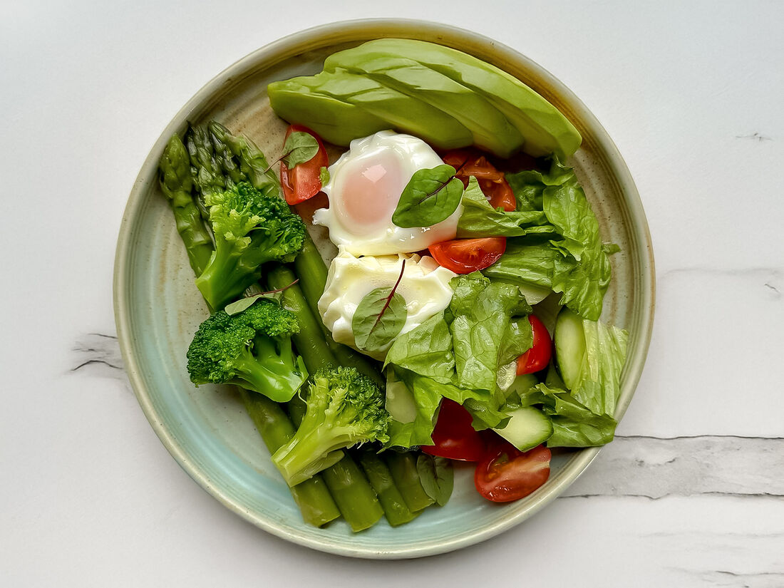 Яйцо пашот с авокадо, спаржей, брокколи, бобами эдамамэ и свежим салатом с соусом песто